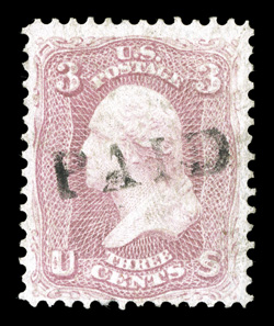 margins, plus it color is especially rich and bright, crisp clean impressi#65, 3c Rose, a magnificent used example of this relatively common stamp, in anything but common quality, as it possesses perfect centering amid uncharacteristically large margins, plus it color is especially rich and bright, crisp clean impression on pristine paper, a neat blue target cancel further complements this stamp's excellent eye appeal, an extremely fine gem in every regard; 2009 PSE certificate (Superb 98; SMQ $475.00); the highest grade the PSE has assigned to any #65. (Image) $3.00