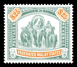 which never materialized, very fine 1992 RPS certificate ex-Dr. YauS.G. #27, 1898 "Pahang/Five cents" and bars on plain paper, without gum as issued, attractive example of this scarce provisional that was proposed for the anticipated 5c rate which never materialized, very fine; 1992 RPS certificate; ex-Dr. Yau (Scott #27; $3,000.00). (Image) £2,500