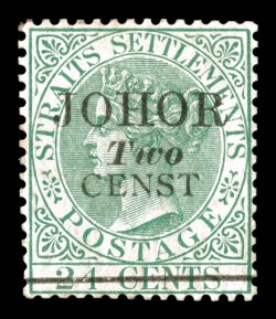 2228 og S.G. #7 S.G. 7, 1885 2c Pale rose, with large JOHORE overprint, deep color, well centered, part o.g., light facial rub at top left, otherwise very fine an immensely rare stamp of