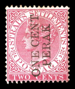 original gum 1991 BPA certificate (Scott 15A $2,300.00).S.G. #30a, 1887 "ONE CENT PERAK" surcharge in black on 2c Pale rose, deep vibrant color, large part o.g., uncommonly fresh and fine; an exceedingly rare stamp, especially with original gum; 1991 BPA certificate (Scott #15A; $2,300.00). (Image) £1,900