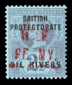 and choice 1990 BPA certificate ex-Allen (Scott 10 $325.00).S.G. #21, 1893 ½p on 2½p Purple on blue, Ty. 7 surcharge in vermilion, beautifully centered, attractive pastel color on bright blue paper, o.g., lightly hinged, extremely fine and choice; 1990 BPA certificate; ex-Allen (Scott #10; $325.00). (Image) £350