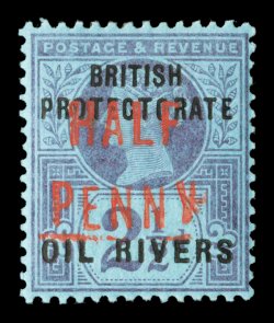very fine scarce with only 60 stamps believed to have been printed 1S.G. #27, 1893 ½p on 2½p Purple on blue, Ty. 8 surcharge in green, pretty mint single, deep colors and well struck surcharge, o.g., small toned spot on reverse only, otherwise very fine; scarce with only 60 stamps believed to have been printed; 1993 BPA certificate; ex-Allen (Scott #13; $475.00). (Image) £425