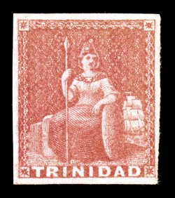 (Scott 6 $3,250.00).S.G. #12, 1857 (1p) Rose red on white paper, rare unused single, four mostly large margins, strong rich color, tiny stain removed, otherwise very fine; 1992 RPS certificate (Scott #6; $3,250.00). (Image) £2,500