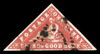 lightly cancelled, there is the faintest trace of a crease at right, vS.G. #13c, 1861 1p Pale milky blue "Wood Block" error of color, large margins all around, beautiful fresh color and an excellent clarity of impression on pristine white paper, lightly cancelled, there is the faintest trace of a crease at right, very fine.This ranks as one of the finest quality One Penny "Wood Block" errors in existence. Nearly all copies have faults, repairs and/or are cut into on one or more sides. This particular example, with its large margins and exceptional overall freshness, is unlike any other we have offered. The aforementioned crease is so faint that it is not even mentioned on the accompanying certificate - we mention it only for strict accuracy. An extraordinary classic stamp and one of the highlights of the Rinkoff collection; clear 1995 BPA certificate; ex-"Cape Town" (Scott #7c; $32,500.00). (Image) £28,000
