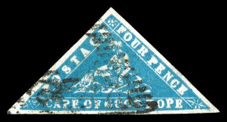 deep impression on pristine white paper, light cancel, faint trace ofS.G. #14c, 1861 4p Deep bright blue "Wood Block", a striking used example of this rare shade, with lavishly large margins all around, spectacularly rich color and a remarkably deep impression on pristine white paper, light cancel, faint trace of a crease, otherwise extremely fine with outstanding eye appeal; clear 1990 RPS certificate; ex-Dale-Lichtenstein (Scott #9c; $5,350.00). (Image) £4,500