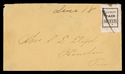 cancelled by manuscript small X and with matching Apl 9th64 postmar#12X1, Beaumont, Tex., 10c Black on yellow, position with comma after "Beaumont", full to mostly very large margins, some slight discoloration to paper from adhesive, neatly cancelled by manuscript small "X" and with matching "Apl 9th/64" postmark on adversity cover fashioned from lined paper, addressed to Mrs. Mary Watson in San Augustine, Tex., the cover was turned and addressed to Mrs. Maggie L. Watson in Sabine Pass, Tex. (wife of C.S. Watson, who was part of the Texas Marine Department), showing both "PAID" and "10" handstamps, some excess glue from the flaps, very fine.One of just five known examples of the Beaumont Ten Cent Provisional on yellow paper - all of which are found only on cover. This cover being perhaps the most desirable of the five not only for its overall condition, but for its use on a turned adversity cover, in addition to being the earliest recorded example of any Beaumont Provisional. The Beaumont provisionals were issued on Pink (two shades) and Yellow paper. Only 21 of any kind are recorded, including the unique Large 10c on Yellow (on cover), 5 of the Small 10c on Yellow (each on cover), and 15 of the Small 10c on Pink (12 covers, 3 off cover). Most of the recorded covers are faulty, and only four have postmarks of any kind tying the stamps.A great Confederate States Postmasters' Provisional rarity; ex-Duveen, Hind. (Image) $55,000.00