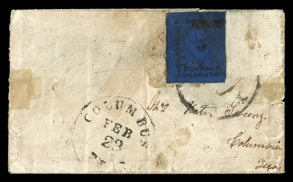 cancelled by pen stroke and tied to small cover to Columbia, Texas by parti#29X8, Goliad, Tex., 5c Black on dark blue glazed paper, the only recorded example of this stamp, with some repairing in top right corner (blue surface color painted in), cancelled by pen stroke and tied to small cover to Columbia, Texas by partial "Goliad Tex." c.d.s., pencil "Missent" and "Columbus Texas/Feb 23" (circa 1864-65) arrival datestamp, additional second stamp at right removed long ago, tape sealed tear to cover, soiled and overall usage faults.The sole example of the Goliad Five Cent Provisional on blue paper. In total there are only Five recorded Type II Goliad Provisionals on any type of paper and this is the only example known on cover.While there is no disagreement that this stamp and cover are not the most visually appealing one could hope for, there is no doubt about their rarity and importance to researchers and students of Confederate States Postmasters' Provisionals, and particularly to specialists in Texas postal history; ex-Ferrary, Hind and Freeland. (Image) $7,000.00