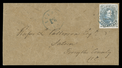 a grid cancel, matching Athens Ga.PaidMar 31 (1862) c.d.s. at l#5X2, Athens, Ga., 5c Red, Type II, four large and wonderfully well balanced margins, bright rich color and a detailed impression, tied to a neat white cover by a light strike of a grid cancel, matching "Athens Ga./Paid/Mar 31" (1862) c.d.s. at left, addressed to a Mrs. Howell Cobb, in care of Col. John B. Lamar, Macon, Ga., stamp with small trivial flaws at top right and has been lifted to apply a tiny reinforcement to the margin, and corner of envelope neatly mended (both done prior to the Caspary sale and noted in that auction description), a very fine and most attractive cover.Of the eight recorded covers bearing the rare Athens Five Cent Red Provisional, this is considered among the finest available, based on the stamp's excellent margins and the cleanliness of the envelope itself. Even off cover examples of this stamp are rare, with probably less than six being known.This is only the second appearance of this cover at auction since the 1956 Caspary sale; ex-Caspary, Kilbourne. (Image) $15,000.00