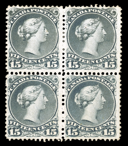 gray shade, attractively centered, o.g., top pair with single h.r.,#30a, 1873 15c Greenish gray, perforated 11½x12, an enormously rare mint block of four of this seldom offered perforation variety, rich luxuriant color in a distinctive Greenish gray shade, attractively centered, o.g., top pair with single h.r., bottom pair faintly hinged, fine-very fine; quite likely a unique block of this Large Queen variety; ex-Dale-Lictenstein, Schneider (Unitrade C$4,800.00 as four singles). (Image) as four singles $4,800.00