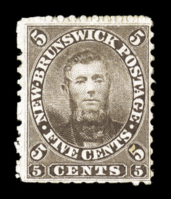 have significant perf. damage either due to scissor separating or being#5, 1860 5c Brown Connell, a handsome appearing example of this rarity, being quite well centered and with nearly intact perforations all around (most of the existing copies have significant perf. damage either due to scissor separating or being roughly pulled apart), rich color, small part o.g., tiny tear at bottom and a faint trace of a corner crease at bottom right, still very fine; among the better condition examples extant within a population of perhaps no more than 50 or 60; 1956 RPS and 1998 Bernard Behr certificates; ex-Argenti (Unitrade C$15,000.00). (Image) $12,000.00