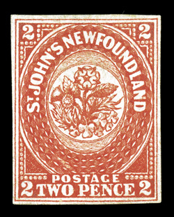 impression, tied to a small 1859 cover from St. Johns to Devon, Englan#2, 1857 2p Scarlet vermilion, a spectacular horizontal strip of three, with margins ranging from close but clear at top to mostly large margins elsewhere, stunning color and impression, tied to a small 1859 cover from St. John's to Devon, England, the strip is lightly cancelled by barred oval cancels and beautifully tied by "Galway/DE 22 59" transit c.d.s. at left, light originating "St. John's/DE 13 59" c.d.s. just below strip, manuscript endorsement "per Circassian/via Galway" at top left, Dublin (Dec. 23) and London (Dec. 24) transit c.d.s. on reverse, very fine; a cover of breathtaking eye appeal and rarity.This cover, bearing the famous and unique strip, is widely considered to be the most outstanding Newfoundland cover in existence. In addition, many seasoned philatelists rank this cover among the greatest classic covers in all of philately. It combines both beauty and rarity in a way that can be fully appreciated by all collectors at any level. Several of the most famous collectors of Newfoundland in history have once owned this extraordinary cover, including Caspary (1956), Stout (1963), Amundsen (1967), Hart (1977) "Foxbridge" (1987) and Chan (1995).When this cover made its auction appearance in the 1956 Caspary sale it is fascinating to note it realized an impressive $12,500.00, among the highest realizations of all of the fabulous rarities found in this legendary collection. By comparison, the unique Two Cent Hawaiian Missionary on cover realized $25,000.00 in the Caspary sale and when it was last sold at auction in 1995 it realized $2,090,000.00 (including premium). One of the highlights of the Gross British North America collection whose sales proceeds will benefit the Smithsonian's National Postal Museum. (Image) Est. $200,000-300,000