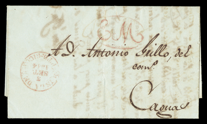 only applied to maritime arrival mail at San Juan, therefore the cover mE M, Ty. 23 red fancy monogram in circle postmark of the Empresa Maritimas (Maritime Enterprise) on 1844 folded letter sent from San Juan to Caguas, this Empresa marking was only applied to maritime arrival mail at San Juan, therefore the cover must have gone to the Empresa in error and then returned to the Spanish post office, where it received a red "Isla de/Pto.-Rico/3 Set., 1844 "Baeza" type c.d.s. and carried overland to the central town of Caguas, some worm holes on reverse, otherwise fresh and very fine; the only known cover with "EM" handstamp used for inland travel. (Image) Est. $1,500-2,000