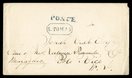 two known examples of the S. Thomas arrival handstamp in blaS. THOMAS, well-struck Ty. 30 octagonal framed handstamp in black applied on arrival to cover to Mayaguez, matching straightline "PONCE" transit postmark, very fine; one of only two known examples of the "S. Thomas" arrival handstamp in black; ex-Roca. (Image) Est. $1,500-2,000