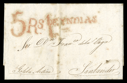 left, couple toned spots on vertical file fold, otherwise very finDE YNDIAS, red Ty. 8 straightline handstamp and matching "5 Rs." and "1" due handstamps on 1837 folded letter from Puerto Rico to Santander, endorsed per "Goleta Activa" at bottom left, couple toned spots on vertical file fold, otherwise very fine; this marking was only used by the Santander administration; ex-Roca. (Image) Est. $150-200