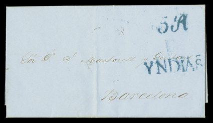 matching 6 reales due, very fine extremely scarce in blue thiYNDIAS, bold blue Ty. 5 handstamp and matching "5R" due on 1850 folded letter with fumigation slits from Mayaguez to Barcelona, partial red Barcelona Baeza style backstamp with matching "6" reales due, very fine; extremely scarce in blue; this letter transited through Lazareto de Mahon in the Balearic Islands, where it remained quaranteened as shown by the "star" perforations used to disinfect; ex-Roca. (Image) Est. $400-500