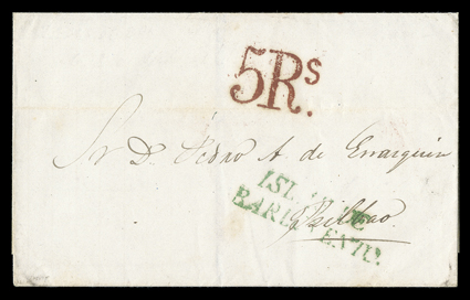 applied on arrival at La Coruna, then overland to Bilbao with theISLAS DE/BARLOVENTO., Ty. 2 two-line straightline handstamp in green on folded cover docketed as being from Guayama in 1844 to Bilbao, marking and bold red "5Rs." due handstamp applied on arrival at La Coruna, then overland to Bilbao with their Baeza style 20 Dec. 1844 backstamp, fresh and very fine; this Ty. 2 handstamp was used by the La Coruna, Cadiz and Santander Postal Administrations and is the only recorded example in green. (Image) Est. $750-1,000