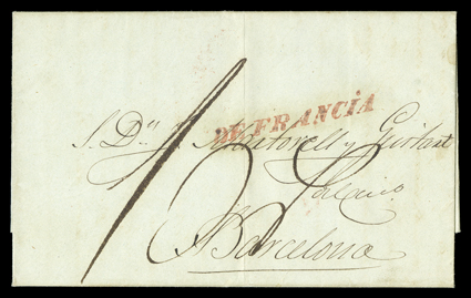 arrival backstamp, extremely fine ex-Roca.DE FRANCIA, bold sloping straightline handstamp in red applied on arrival in Spain to 1847 folded letter from Puerto Rico to Barcelona, ms. "1 oz" rate, Barcelona Baeza type arrival backstamp, extremely fine; ex-Roca. (Image) Est. $500-750