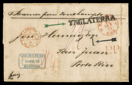 Steamer from Southampton, Puerto Rico backstamp and handstam1872 Incoming cover from Germany, stampless folded letter with red "Hamburg/14 3 72" datestamp, red London transit and matching "P.P." (pre paid) with magenta ms. "1/-" rate, endorsed "Steamer from Southampton", Puerto Rico backstamp and handstamped "1" arrival postage due for single weight, bold straightline "YNGLATERRA" handstamp, usual file fold not affecting the markings and a bit toned, very fine strike; the only reported example of this straightline "Ynglaterra" origin marking; 2005 Sismondo certificate; ex-Roca. (Image) Est. $2,000-3,000