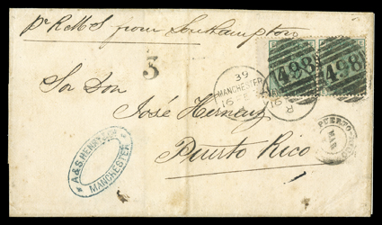to Puerto Rico, endorsed Pr R M S from Southampton, PuertoGreat Britain #64a, 1873 1/- Deep green, Plate 8, left wing-margin horizontal pair, tied by two strikes of "Manchester/16 Fe 74" and "498" in barred oval duplex cancel to folded cover to Puerto Rico, endorsed "Pr R M S from Southampton", "Puerto Rico/mar 1" arrival c.d.s. and matching "3" (3 times 25c) due handstamp for interior postage, very fine; ex-Gallagher. (Image) Est. $200-300