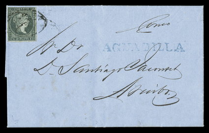 started using postage stamps on June 1855 and almost all were cancelledCuba #1, 1855 ½r Blue green, single tied by Parrilla killer to 1856 folder letter to Arecibo bearing blue straightline "AGUADILLA" handstamp, fresh and very fine; Puerto Rico started using postage stamps on June 1855 and almost all were cancelled by a Parrilla killer, this is an unusual usage of a straightline townmark during the philatelic period. (Image) Est. $200-300