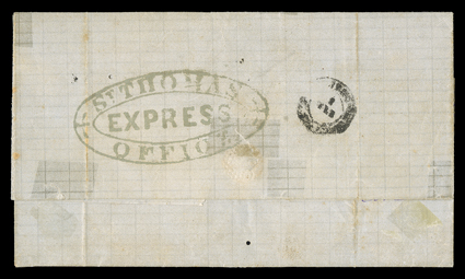 mostly internal splits reinforced with archival tape, very fine strSt. THOMAS/EXPRESS/OFFICE" greenish handstamp on reverse 1878 stampless folded letter from St. Thomas to San Juan, "3" reales due handstamp and arrival backstamp, cover with some mostly internal splits reinforced with archival tape, very fine strike; the "St Thomas Express" forwarding agency was created by a group of merchants to expedite their correspondence and was in operation from 1861-66, this is one of five known covers to Puerto Rico; ex-Roca. (Image) Est. $1,000-1,500