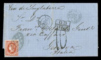 67 postmark to Genoa, Italy, endorsed Via de Ynglaterra and caCuba #21, 1864 2r Vermilion on buff, single with ample to large margins all around, tied by neat Parrilla killer to 1867 folded letter with clear "P. de Mayaguez/Puerto Rico/26 Nov 67" postmark to Genoa, Italy, endorsed "Via de Ynglaterra" and carried on board the Spanish steamer Barcelona, entered the British mails with "St. Thomas/Paid/No 30 67" datestamp (pencil enhanced), London transit backstamp and boxed "GB/1F60c" accountancy handstamp, Calais entry c.d.s. with "10" decimes due for French transit and Genoa arrival backstamp, very fine; one of only five recorded covers from Puerto Rico franked by this stamp. (Image) Est. $1,000-1,500