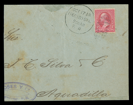 postmark, Arecibo transit and San Juan Military Station backstamps, cover reduced at top, fine and rare early usage; ex-Rudman. (Image) |