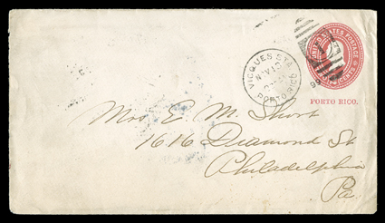 duplex postmark showing spelling error "Juan" for "Juana", San Juan and New York backstamps, trivial opening tear at top right clear of the indicia, otherwise very fine; this is the last numbered station and early mail is unknown, with this being one