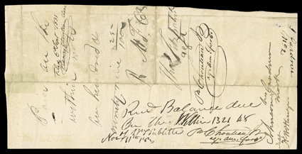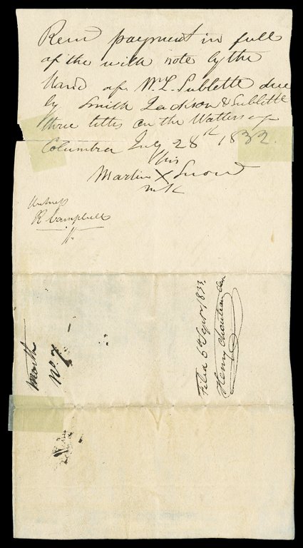 Smith Jackson & Sublette, 1 page, oblong 8vo, Wind River, (present-day[1830 Rendezvous, Campbell, Fitzpatrick, and Sublette] Exceptional triple autograph item while at the 1830 rendezvous. An Autograph Document Signed "Thos. Fitzpatrick / agt / Smith Jackson & Sublette," 1 page, oblong 8vo, Wind River, (present-day Wyoming), July 28, 1830. Issued at that year's rendezvous, Fitzpatrick writes that "As a settlement of all acct. up to this date with (Martin?) Irroquois there appears a ballance due by us to him of fourteen hundred & fifty two dollars forty cents which we promise to pay him on demand." On the verso is an Autograph Document Signed in body by William Sublette: "Rec'd payment in full" with note in the hand of W.L. Sublette "due by Smith Jackson & Sublette … on the Watters of Columbia Aug 28th 1832" signed by Martin Sword (the Iroquois trapper to whom Fitzpatrick wrote the note) with his "X" mark. With witnessing Signature of "R. Campbell". Also docketed by clerk Henry Chouteau. Insignificant corner repair. (imagea) (Image) Est. $2,000-3,000