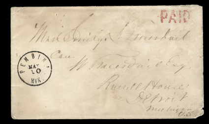 under the State of Minnesota, addressed to Toronto with arced U.[Pembina Postmarks, 1858/1862] two covers, first from the Ross correspondence with manuscript "Pembina/May 15/58" postmark and matching "10" rate from the intermittent period while under the State of Minnesota, addressed to Toronto with arced "U. States/10" exchange office handstamp and "6"(d) due handstamp, second a late use of "Pembina, Min/May 10" (1862) datestamp on cover to Detroit with red straightline "PAID" handstamp applied at the Red River Settlement, former very fine, latter lightly toned and fine; latter ex-De Volpe.When the state of Minnesota was formed March 2, 1858, all of the territory between the Red and Missouri rivers reverted to an unorganized status until the formation of Dakota Territory on March 2, 1861. Sometime after Minnesota became a state the Pembina postmaster used a handstamp which read "Pembina, Min." This handstamp was used as late as 1862. (imagea) (Image) Est. $3,000-4,000