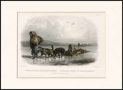 Hurlimann engravers. Holscher in Koblenz, Ackermann in London, Bertrand[Mandans] Two Engravings "Dance of the Mandan Indians" and "Dog-sledges of the Mandan Indians" c. Bodmer, painter, Bougeard, publisher, former Desmadryl and latter Laderer & Hurlimann engravers. Holscher in Koblenz, Ackermann in London, Bertrand in Paris, [ca 1839-43]. Embossed "C. Bodmer" at bottom. Vignette XXV and XXIX from Maximilian of Wied's Travels in the Interior of North America, each 11.5" x 15.75", latter matted. (imagea) (Image) Est. $500-750