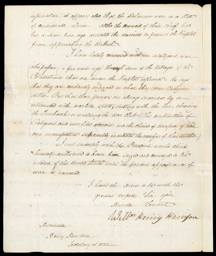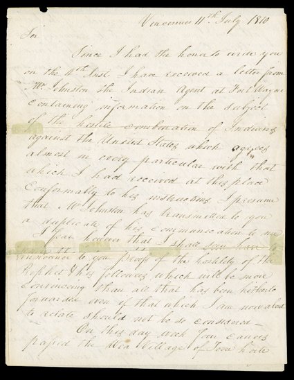 would climax in Tecumsehs War. All are written from Vincennes, the ter[The Prophet and Tecumseh, William H. Harrison] Four important Letters Signed by Harrison as governor of the Indiana Territory, 1808-1810, on Native American hostilities that would climax in Tecumseh's War. All are written from Vincennes, the territorial capital. The first, to Secretary of War Henry Dearborn in May 1808, informs him that: "The Shawnee imposter" generally known as the Prophet has "acquired such an ascendency over the minds of the Indians that there can be little doubt of their pursuing any course which he may dictate to them, and that his views are decidedly hostile to the United States is but too evident. The Prophet had selected a spot on the upper part of the Wabash for his residence and had engaged a considerable number of Potawatimies Ottawas Chippawas and other northern Indians to settle there under his auspices. This circumstance so alarmed the (American-friendly) Miamis & Delawares that they resolved to defeat the measure at any risk and the Chiefs of the latter set out to inform him of their determination. The Prophet would not however deign them an interview but dispatched his brother (Tecumseh) to meet them, whose threats or whose persuasions were sufficient to drive back the Chiefs. I have lately conversed with an intelligent man who passed through some of the villages of the Potawatimies that are under the Prophets influence. He says that they are constantly engaged in what they term religious duties. But that their prayers are always succeeded by or intermixed with warlike sports, shooting with the bow, throwing the Tomhawk or wielding the war club. I most sincerely wish the President would think himself authorized to have him seized and conveyed to the interior of the United States until the present appearance of war is removed."A year later, he writes the new secretary of war (William Eustis) that reliable reports indicate "that the Prophet and his followers had determined to commence hostilities to 'sweep all the white people from the Wabash and white River' after which they intended to attack the Miamis." Harrison's informant "thinks there is no real understanding between the Prophet and the Ottawas and Chippewas. About eight days ago he had with him three hundred and fifty warriors well armed with Rifles and tolerably supplied with ammunition. … The Prophet cannot keep the number of men which he now has embodied any length of time; as soon as they disperse I shall dismiss the two Companies."In April of 1810 he writes to Eustis: "The Showonoe Prophet is again exciting the Indians to Hostilities against the United States...He has at least 1000 souls under his immediate control principally composed of Kickapoos & Winebagos but with a considerable number of Potawatimies & Shawanoes & a few Chippewas and Ottowas. The friends of the French Traders amongst the Indians have advised them to separate themselves from the Americans in this town. I have no doubt that the present hostile disposition has been produced by British interference. It is certain that they have rec'd a considerable supply of ammunition from that source...There are not more than a full Company of American Militia in the Town, & the French for any military purpose are worth nothing. ..." He then recommends that a fort be built on the Wabash to help protect the region. That July 11, he reaffirms his opinion, explaining that a week earlier "four canoes passed the Wea Village of Terre Hoite (sic) … I dispatched a Lieut. of Militia and eight men to see what had become of them. .. they had left their canoe there and had gone to the meeting of the Shakers on Sunday." On their return trip, they quickly scuttled the canoe and "stole five horses. Those fellows were all completely armed had no skins to trade with …. I have forbad their pursuit of the thieves because I know it will produce blood shed. … I am convinced that the pursuit was desired by the Indians & that a larger party was lying in ambush. As long however as no Blood is spilt I shall have hopes of bringing the Prophet to reason. But our people will not suffer their property to be taken & I daily expect to hear of some Indians being killed in an attempt to take off horses. I fear that some of the friendly Indians will suffer from the crimes of others. I have no other expectation than that of seeing all the Tribes united against us in six months after hostilities shall have commenced."All letters with some fold and edge wear, with some splitting, most notably this last letter, which is separated at hinge and at bottom fold, with repairs and reinforcement using Japanese paper strips. That letter is in good condition; the others are much better.Just a month after this last letter, Tecumseh and 1000 warriors came to Vincennes to repudiate the 1809 Treaty of Fort Wayne. Harrison refused to abrogate the treaty, and Tecumseh began inciting his men to attack Harrison's smaller force. While Tecumseh was away, Harrison led a force to Tippecanoe, the Prophet's village. Though the Prophet offered a parley, he instead attacked the army's camp. His forces were repulsed, and he abandoned the village. The battle marked the end of the Prophet's significance, though Tecumseh continued to lead his people in resisting American encroachment throughout the War of 1812. As Harrison's suspicions show, difficulties between the United States and its Native American neighbors were believed to be encouraged by the English and Canadians, a belief that would help lead to the coming war. (imagea) (imageb) (imaged) (Image) Est. $10,000-15,000