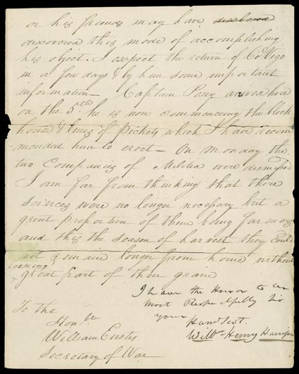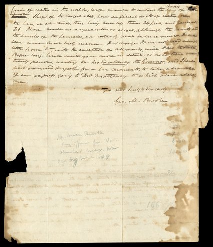 most tedious and fatiguing march of twenty days through the wilderne[First Seminole War, The Fall of Pensacola] Historic Autograph Letter Signed by "Geo. M. Brooke," 1 pages, 4to, Pensacola, June 1, 1818. He writes to a Mr. Nivison, "After a most tedious and fatiguing march of twenty days through the wilderness, from the Appalachicola we arrived at this place, which we entered, without resistance notwithstanding the repeated declarations of the Spanish officers that we should be fired upon...The Governor had retired to the Barrancas, a strong work, commanding the entrance of the Bay of Pensacola, with about 300 troops, determined to defend it...On the 25th ultimo we set down before his work, and...erected a battery...A severe canonading commenced at sun rise, lasted that day and part of the next, when he thought proper to capitulate...We had a few killed and wounded, the enemy many more. Genl. Jackson with his volunteer(rs se)t out for Tennessee, the day before yesterday, leaving the regular troops...The whole of the Floridas, with the exception of St. Augustine, has been ceded to the American Forces, subject to the decisi(on) of the President...I trust they will never be returned, as in the present situation of Spain, she is entirely unable, to restrain, or keep in check her own Indians, who who treated the Spanish inhabitants, as their slaves, killing their cattle, and destroying their property as they pleased. I am now the Civil and Military Governor of West Florida, with as much trouble upon my hands, as any fellow ever had. …." Condition problems exist, namely some dark staining at left and right edges, with some acid wear along top fold creating an unobtrusive hole. Pieces out at right affect five lines of text. However, the extraordinary historical value of this letter well overcomes such defects. The Spanish were not directly involved in the Seminole War, and Jackson's willingness to attack their forts in West Florida earned him the ire of Secretary of War John C. Calhoun. Within eight months, a treaty was hammered out in which Spain ceded West and East Florida to the United States. Jackson had captured Pensacola before, during the War of 1812, but was obliged to return it to Spanish control in the Treaty of Ghent. (imagea) (Image) Est. $1,000-1,500