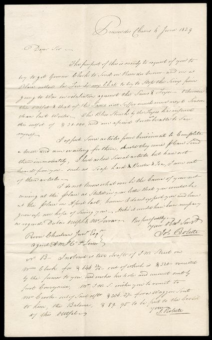 (now Wisconsin), June 6, 1829. With straight-line Galena, IL postmark,Rolette, (Jean) Joseph, Trying to prevent a war between the Sioux and the Sauks and Foxes, Outstanding autograph letter signed twice, from Prairie du Chien, Michigan Territory (now Wisconsin), June 6, 1829. With straight-line Galena, IL postmark, June 8, and 18-3/4 rate. Rollete writes Pierre Chouteau Jr. of the American Fur Company:"to request you to try to get Governor (William) Clark to send in River des Moins and on a place called La Tourche aux Chats to try to stop the Sioux from going to War in retaliation ageinst the Saucs & Foxes - otherwise this outfit & that of the Saucs will suffer much more next season...The blow struck by the Foxes has injured this outfit of $20,000, and am afraid I will not be able to Save myself..." He encloses two drafts (not present), one for Indian agent J.M. Street, and one for Ramsay Crooks, for a wagon. Commissioners were dispatched and arrived a month later. A treaty was signed, but by 1830, a Sioux chief and his family were killed by a group of Sauks and Foxes. Governor Clark attempted to establish peace once again in 1831, but a Sauk and Fox war party massacred a party of Menomonees. These troubles culminated in the Black Hawk War of 1832.Rolette, Joseph - Canadian American fur trader (1781-1842); traded for the Mackinac Company, establishing a post at Prairie du Chien; became a partner when it was reorganized as the South West Company; sold out to the American Fur Company in 1815 and became their agent. (imagea) (Image) Est. $400-500