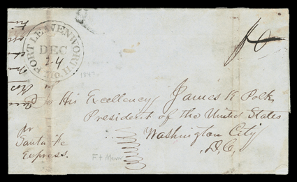 James K. Polk, and carried by military express over the Santa Fe traiPer Santa Fe Express, manuscript directive on folded letter with integral address leaf datelined "Fort Mann Upper Arkansas (River), December 6th, 1847" addressed to President James K. Polk, and carried by military express over the Santa Fe trail to Fort Leavenworth, where it entered the mails with "Fort Leavenworth, Mo./Dec 25" datestamp and manuscript "10" rate, which was then written over with an "f" because it was free to the President, docketed by W.R. Marcy, Secretary of War to Polk, toned file fold through the postmark, fine.The writer, Captain Napoleon Koscialowski of the Indian Battalion of the Missouri Volunteers, writes his desire to resign to President James K. Polk.Fort Mann was located on the Santa Fe Trail about 26 miles below the "Cimarron Crossing" of the Arkansas River. It was an adobe stockade built about 1846 by the U.S. Government as a repair and supply depot for the army. In freighting days it was 359 miles from Fort Leavenworth and 423 miles to Santa Fe. The post was abandoned in 1854. (Image) Est. $750-1,000