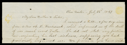 Sandwich Islands and endorsed Recd Honolulu, Sand. Islds. Decr 16 19[Oregon Missionary Mail via Hawaii] folded letter from Sarah Smith datelined "Clear Water Nez Perces Mission Oregon Ter Sept 6 1839" to West Brookfield, Mass., carried via the Sandwich Islands and endorsed "Rec'd Honolulu, Sand. Islds. Decr 16 1939" on reverse, entered the mails with red "New York/Ship/Apr 26" datestamp, almost eight months after it was written, some internal splits, very fine; one of only three or four letters written by Sarah from her Oregon days (1838-42), though she did leave a diary of her experiences.Sarah Gilbert White Smith, one of six white women to make the overland journey, over the Rocky Mountains to Oregon. A 1,900 mile "tour de force", for a female riding side-saddle on horseback, in 1838. Sarah writes to her brother on personal and religious matters, mentioning her husband, the Rev. Asa B. Smith and her longing for home and loved ones - that she may only see them again in heaven - Then she tells of what they are doing: "You will learn that we have spent the summer at the Kameah - That is the inviting field for a station of any in the Mission, as a largest number of people can be gathered there than, any other place & some of the most influential of all the Nez Perces tribe are located here, & in no place is the language spoken so purely - for these reasons & that my husband may be of greater service to the Mission of translating &c…It is a beautiful valley 60 miles from Mr Spaldings (Rev. Henrey Harmon) & about 200 from Wieletpoo (Dr. Marcus Whitman's Mission)…You know it has been said that this language was very deficient in words. That faith & repentance could not be expressed &c &c. Husband says that when the language is sufficiently understood he thinks there will be no want of words to express any idea whatever…Your sister Sarah." (Image) Est. $2,000-3,000