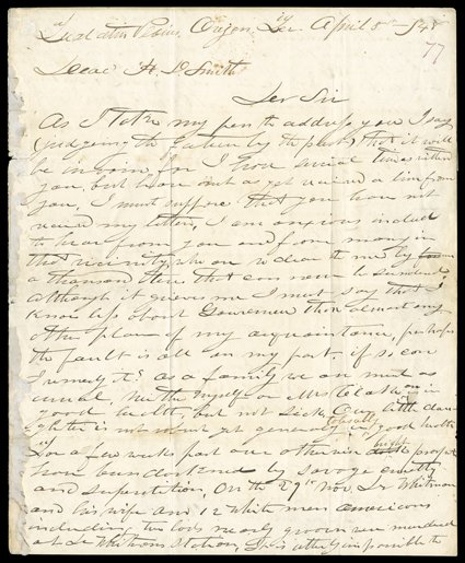 Gouverneur, NY, April 8, 1848. He tells of the massacre by Native Americans of[The Whitman Massacre] Remarkable content letter, with integral postmarked address leaf, from Rev. Harry Clark at Tualatin Plains, Oregon Territory, to Isaac Smith in Gouverneur, NY, April 8, 1848. He tells of the massacre by Native Americans of missionary Marcus Whitman and his wife, Narcissa, as well as most of the residents at their settlement near present-day Walla Walla, Washington:"For a few weeks past our otherwise bright prospects have been darkened by savage cruelty and superstition. On the 29th Nov. Dr. Whitman and his wife and 12 white men Americans including two lads nearly grown were murdered at Dr. Whitman's Station. It is utterly impossible to ascertain the whole truth...The Doctor's Indians (Kaus) were the only Indians engaged in this horrible affair…The Indians were sick and many dying perhaps 30 in a few weeks…The Doctor was all attention night and day. The Indians were told...that the Doctor was giving poison or bad medicine consequently they decided to kill the Do. & Mrs. Whitman. While they murdered all the emigrants…they could we cannot say. Several men escaped…The Nez Perce chief Ellis has some two years since told the Catholics that should they come and establish missions…where the protestants were it would be a declaration for war…The priests and the French, as well as the HB Company were not injured or molested…Mr. Spalding escaped after 6 days & nights of severe toil and hunger...Mr. Spalding is now with me likewise his family. All praise is due to Hon. H.B. Co. for their prompt and efficient action in delivering the captives, number perhaps 40...An army has been raised and the Murderers have been driven from this country, but the war is not at an end...The gov't of U. States has long neglected this country…"Carried overland and posted at Savannah, Missouri on July 27, as per postmark plus the collect rate handstamped "10". Whitman and Spalding, with their wives - the first white women to make the overland journey - took the first wagons through the Oregon Trail. Dr. Whitman was killed and his body mutilated. The incident set off the Cayuse War, and in 1850 five warriors (at least one of whom appears to have been innocent) were hanged for the murders. (imagea) (Image) Est. $2,000-3,000