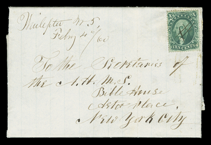 4th60 Washington Territory postmark and 10c Green, Ty. II (32, te[Reverend Henry Spalding and the Oregon Missions, 1860] folded letter with integral address leaf datelined "Fort Walla Walla W.T. Jan 2 1860" with manuscript "Wailepta W.T./Feby 4th/60" Washington Territory postmark and 10c Green, Ty. II (#32, tear) to the American Home Missionary Society in New York City, very fine; ex-Jarrett.A wonderful long letter written by the Reverend Henry Harmon Spalding regarding his present situation and labors among the Indians of the Old Oregon Country. He wants their continued support of his church among the Indians and that he is the only person living who can write and preach to them in their language. Spalding also vividly describes toil and hardship of a pioneer missionary and the bitter competition between the Catholics and the Protestants in their efforts to civilize and christianize the Indians. (Image) Est. $2,000-3,000