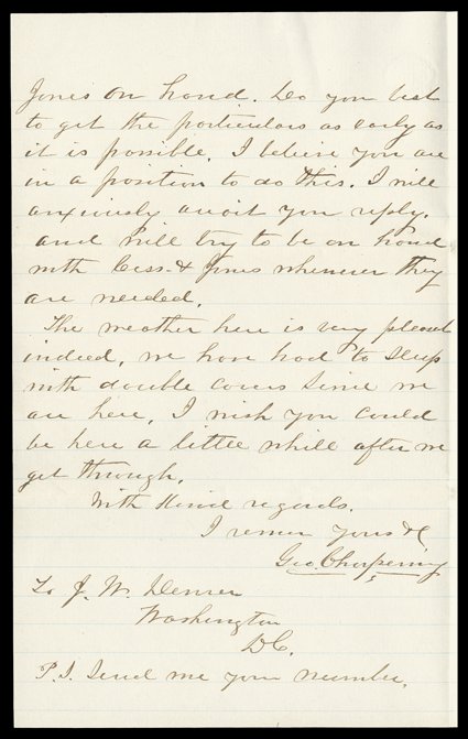 James W. Denver, Governor of Kansas Territory, California government off[Overland Mails, Denver Correspondence] With letters by and about Estill, Chorpenning, and Russell, Majors & Waddell, a small but interesting group of 12 letters to and from James W. Denver, Governor of Kansas Territory, California government official, US Indian Agent, Civil War general, and staunch Democrat. These concern attempts to establish, improve, and dominate overland mail service. An 1858 letter from Mokelumne Hill, CA, describes the resurgence of gold mining after some have found Canada less rewarding. The same year, W.L. O'Connor is "getting capital to complete a Railroad from Sanfrancisco to St. Jose...If I could get a grant of land or other assistance, I would undertake to get Capital for five hundred miles." Meanwhile, Denver hears from J.W. Estill, who had attempted to establish an express company between Missouri and the west. Estill writes again in October 1858 that "we have been greatly excited by the arrival of...overland mails in less than 24 days. Steamships are at a discount, and public attention has been greatly directed towards staging. It will...advance the interest of the Tehuantepec Company, for we will never be contented with the Panama route again..." Five years later, Denver's brother Arthur writes that California is going wild and "Everybody is leaving for Reese River...It is said that the Reese River Mines completely eclipse those of Washoe. The ore...pays over a dollar a pound...the emigration across the plains this year is very heavy."The first government overland mail from Salt Lake City to California was established by George W. Chorpenning, who in 1869 sends two ALS to Denver from Pennsylvania, soliciting his help in getting congress to help recover his losses in operating the service. A very interesting 1877 letter from Arthur Denver concerns the case of Eugene Allen, who wants to get a relief bill before congress for wagons and cattle sold to General Easton but not paid for by express company Russell, Majors, and Waddell. Arthur wants to take the case, but in a later letter seems confused by the details. (imagea) (Image) Est. $1,500-2,000