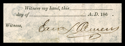 certificate for the same, No. 6, May 19, 1863, signed by H.D. Bequette,[Samuel L Clemens (Mark Twain), Mining Stock Certificate] Scarce early Document Signed "Sam. L. Clemens" on verso, transfer of 10 shares of the Fresno Mining Company. On the certificate for the same, No. 6, May 19, 1863, signed by H.D. Bequette, secretary, and B.F. Hawley, president, "Esmerelda Mining district / Aurora, Mono Co., Cal." With 25-cent revenue stamp at left, cancelled by Bequette. Vignette of two Indians and tepee at center, dog's head facing left at bottom. Clemens' transfer otherwise unaccomplished.Clemens, Samuel L. - American author, lecturer, and journalist, typically writing under the pen name Mark Twain (1835-1910); perhaps the most beloved American author, for his many humorous tales and his novels. One odd feature of this certificate is that it is from Aurora, California. After a survey in 1863, it was decided that the town, then called Esmeralda, was actually in Nevada. The great majority of Clemens autographs come from the years after he achieved national fame in 1865. (imagea) (Image) Est. $2,000-3,000