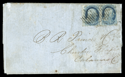 three known some toning in spots.Crossing the Plains, (Baird #47) Barber & Baker, 1853. S.W. Bush writes from Placerville, CA, 11/28/1854: "I am in the land of gold...I saw two men hung the third of this month..." three known; some toning in spots. (Image) Est. $1,500-2,000