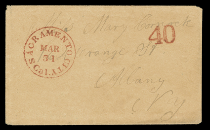bold red Sacremento, Cal.Mar 31 datestamp and matching 40 ratePilot Creek Canal, Georgetown, El Dorado County, (Baird #87) attractive illustrated lettersheet with "Sacremento, July 30th 1854" dateline on the letter, also includes cover with bold red "Sacremento, Cal./Mar 31" datestamp and matching "40" rate to Albany, N.Y., both extremely fine. (imagea) (Image) Est. $1,500-2,000