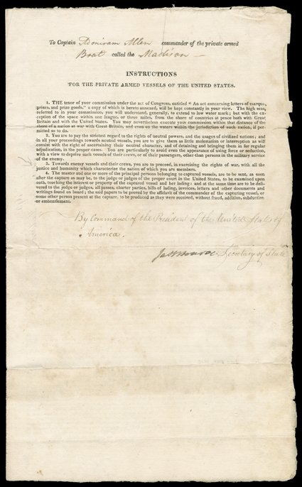1812. The first is to Adoniram Allen, commanding the privateer th[Privateer Instructions, James Monroe] Pair of partly printed Documents Signed "Jas. Monroe" as Secretary of State, 4 pages, legal folio, June 6, 1812; and 1 page, 4to, November 7, 1812. The first is to Adoniram Allen, commanding the privateer the Madison and provides: "Instructions for the Private Armed Vessels of the United States: 1)...The high seas, referred to in your commission, you will understand, generally, to extend to low water mark; but with the exception of the space within one league, or three miles, from the shore of countries at peace both with Great Britain and with the United States...2) You are to pay the strictest regard to the rights of neutral powers, and the usages of civilized nations...3) Towards enemy vessels and their crews, you are to proceed, in exercising the rights of war, with all the justice and humanity which characterize the nation of which you are members..." The congressional Act authorizing letters of marque is printed. The second, to Capt. John Evans of the privateer schooner Stark, gives "Additional Instruction...The public and private armed vessels of the United States are not to interrupt any British unarmed vessels bound to Sable Island, and laden with supplies for the humane establishment of that place" Sable Island, off the coast of Nova Scotia, was the site of a life-saving station. This document is tipped to a slightly larger sheet. The June document has edge wear and some uneven toning. (imagea) (Image) Est. $1,000-1,500