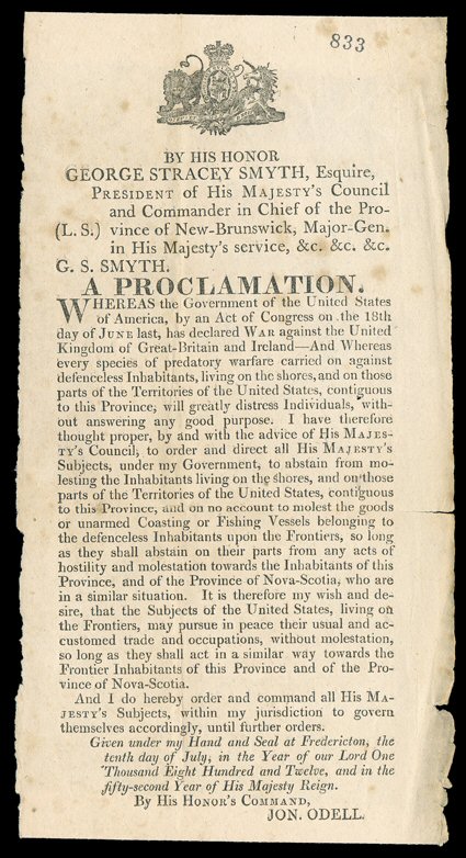 Washington, 1812. 8vo, 24 pages, no wraps. String bound. Pri[Declarations of War and Peace] Three printed items and one document concerning the declaration of war or the negotiations for peace. Includes Declaration of War. James Madison. Washington, 1812. 8vo, 24 pages, no wraps. String bound. Printed as "Important State Papers," explaining that "The injunction of secresy [sic] was about an hour ago removed from the following Message, Report, and Act," and then gives the text of the declaration of war on June 19, 1812. Minor dampstains throughout. With an interesting British broadside issuing the "Proclamation" by George Stracey Smith, commander in chief of New Brunswick, stating that:"Whereas .. the United States of America...has declared War against the United Kingdom.....to order and direct all His Majesty's Subjects, under my Government, to abstain from molesting the Inhabitants...and on no account to molest the goods or unarmed Coasting or Fishing Vessels belonging to the defenceless Inhabitants upon the Frontiers, so long as they shall abstain on their parts from any such acts of hostility and molestation towards the Inhabitants of this Province, and of the Province of Nova-Scotia." Modern archive stamp at top right, some foxing. With Message from the President of the United States Transmitting Communications from the American Ministers at Ghent..." Madison, Adams, et al. Washington, A & G Way, 1814. 8vo, 74 pages, no boards. The American ministers - John Quincy Adams, James A. Bayard, Henry Clay, Jonathan Russell, and Albert Gallatin, were at the time of this message (December 1) less than ten days away from finishing their negotiations, the letters that President Madison forwards being already more than a month old. Finally, with a manuscript document, March 13, 1815 (but misdated 1814), a receipt for payment to Joseph Currier for "Ringing 28 Bells from Mch 16th 1814 to January 16th 1815 for Towp. Meetings - $3.50" but also for "Ringing Bell for Peace - $1.50." Currier signs in receipt of his $5. (imagea) (Image) Est. $400-500
