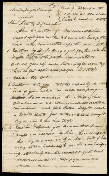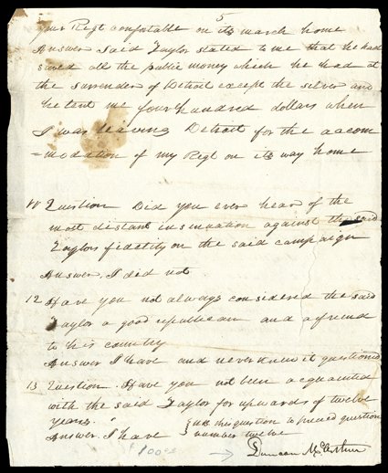 October, 1814. His deposition in the matter of Genl. James Taylor[American Surrender of Detroit] Historic Document Signed by Brigadier General "Duncan McArthur," 5 pages, legal folio (4 pages) and 4to (on a separate sheet), Pendleton, Kentucky, October, 1814. His deposition in the matter of Genl. James Taylor v. John Leathers, a suit brought in response to Leath's claims that Taylor had acted not just negligently, but also treacherously, in the surrender of Detroit. After establishing that McArthur served with Taylor under Genl. William Hull at Detroit, the deposition, in the usual question-answer form, continues:"2) Question: Will you state the capacity in which each of you acted on said campaign - I commanded the v. Regt. of Ohio Volunteers and was considered second in command and Genl. James Taylor acted as Quarter Master Genl. to the Western army & Pay master to the ohio troops ...5_ Question: Did not...Taylor warmly recommend Genl. Hull's going on to Malden (Fort Malden, across the Detroit river in Amherstburg, Canada) at all the councills? Answer: To the best of my recollection, he did, and at other times often arged the propriety of making an immediate desent on Malden both to the commanding Genl. & many of the other officers...6) Question: Did not...Taylor oppose the retreat of Genl. Hull from Canada? Answer: To the best of my recollection, he did. 7) Did...Taylor not come once...after the return from Canada and State to you all...that Genl. Hulls conduct was not correct and that from a conversation with him that he thought he (Hull) would dissapoint all our reasonable expectations...that he expected to be attacked by a Host of Indians, North West company men, and British and yet would not consent to write Governor [Charles] Scott of Ky for reinforcements...?" McArthur affirms that Taylor did so. "Did not the said Taylor make a proposition to take the command from Genl. Hull and give it to you?" McArthur names another officer as the source of that suggestion, but notes that Taylor agreed. He also confirms that Taylor sent a letter, which McArthur also signed, to Gov. Scott asking for reinforcements. Subscribed by two justices of the peace. First four pages with bottom 1/10 nearly separated, and with two splits repaired. Genl. James Taylor was one of the founders of Newport, Ky, which benefited greatly from his position as quartermaster, as he was able to make the town a supply hub. John Leathers was taking on not only one of Kentucky's richest men, but also one who was very well connected: among his cousins were sitting President James Madison and future President Zachary Taylor. Duncan McArthur was a man of substance as well. After being captured at Detroit (as militia, his men were instantly paroled to their homes) he was exchanged and then served under William Henry Harrison. When Harrison resigned in 1814, McArthur became commander of the Army of the North-West; he was later Governor of Ohio. As we see here, the officers under William Hull were nearly at the point of mutiny in response to his defeatism. (imagea) (Image) Est. $1,000-1,500