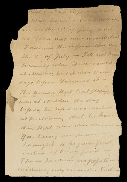 no information (of) war having been declared, and on the 1st of[William Hull Surrenders Detroit] Intriguing Autograph Fragment Signed "Wm. Hull," 2 pages, 12mo, on an irregular sheet, no date or place. He writes to Elisha Whittlesey:"had rec'd no information (of) war having been declared, and on the 1st of July had no Idea that war was declared. I received the information on the 2d of July. I do not know precisely when it was received at Malden, but it was some days before I received it. It is known that Capt. Chapin was at Malden, the day before, his vessel was chartered at the Miami, that he knew then that war was declared. If so, being an American, he ought to be punished instead of being paid. I have however no positive evidence, only circumstantial ... and he could not been there, without be informed of it. That he refused to keep the west shore, although, I advised or directed him to. If you desire it, I will give my affidavit, of the contract, with these circumstances."Edges chipped, affecting text, which clearly originally extended above the current top of the sheet. Small strip attached to left edge of first page with seal. The first hostile action in the War of 1812 was the capture of the packet ship Cuyahoga, which was taking supplies to meet Genl. William Hull in Detroit. On July 2, the boat's captain, Luther Chapin, allowed six Canadians in a longboat to board the ship and seize it. The seizure was a disaster for the Americans, for in addition to supplies and some ill soldiers, the ship carried copies of all of Hull's correspondence with Secretary of War. The British knew the size and disposition of Hull's forces and their plans for the near future. They besieged Fort Detroit in mid-August and Hull surrendered after two days. He was court-martialed for his actions and convicted, but President James Madison gave him a reprieve before he was to be shot. With Newspaper: Federal Republican, and Commercial Gazette, vol. VI, No. 862, Georgetown, DC, September 7, 1812. Includes a British Account of the capture of Detroit, and General Hull's army, by capitualation on the 16th of Aug. 1812. (imagea) (Image) Est. $750-1,000