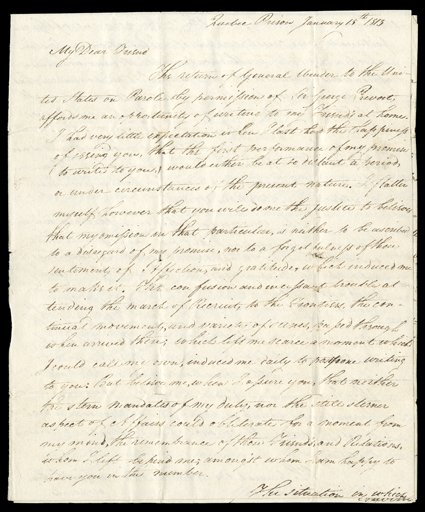 three autograph letters by Thomas Randall, an American prisoner of war in[American Prisoners of War in Canada] Outstanding lot of letters and printed documents concerning prisoners in the war between the United States and Great Britain. Includes three autograph letters by Thomas Randall, an American prisoner of war in Quebec Prison, January-June 1814. The first letter goes by Genl. William H. Winder, who has been exchanged after his capture at Stony Creek in July 1813 (and would later be routed at Bladensburg, MD). In it, Randall writes, "The situation in which we have been placed since the commencement of this unfortunate and cruel System of Retaliations...has been rendered as comfortable … with a strict and unrelenting confinement. We are allowed Books in our Prison ...The consciousness likewise that our misfortunes are unmerited and our Country will take every measure...to reinstate us to the rank of Freemen, dispels the gloom. .. Every circumstance...seems to indicate a speedy Exchange."However, in April, while others are being exchanged, Randall has not. In June, he writes asks a friend to "...Attribute it to the peculiar situation in which we are placed as Pr. of War, which precludes us from entering on any topic not particularly relating to ourselves…." These letters show the sharp contrast in the treatment of officers and of regular soldiers. While Randall and his colleagues were reading and socializing in confinement, American regulars were crammed into prison ships in Quebec Harbor, where many died of exposure and illness.With printed Broadside proclaiming the Cartel for the Exchange of Prisoners of War between Great Britain, and the United States of America, 22.5" x 17.5" Signed in type by James Monroe, May 12, 1813. With Book: Message from the President of the United States, Transmitting Documents Relative to the Commencement and Progress of any Acts or System of Retaliation upon Prisoners of War... James Madison. Washington, A & G Way, 1814. 8vo, 48 pp, no wraps. String bound. One measure of retaliation that had been taken was the British confinement of two American officers for every one British officer in American hands. Front cover detached but present. (imagea) (Image) Est. $1,500-2,000