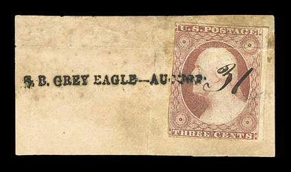 franked by 10c Green, Ty. III (15), large margins to touching, tiedGalena, Dubuque, Dunleith & Minnesota/Packet Company/Steamer Grey Eagle/Captain D. Smith Harris. Steamboat illustrated advertisement in blue on cover to Oakland, Canada West and franked by 10c Green, Ty. III (#15), large margins to touching, tied by "Hastings, M.T./Sep 18" Minnesota Territory datestamp, red oval "United/6d/States" exchange office handstamp, Paris and Windsor transit backstamps and red "Oakland, U.C./Sp 23, 1857" arrival backstamp, very fine and attractive; the only reported example, illustrated in Risvold.The Grey Eagle was a side-wheeler of 382 tons built at Cincinnati in 1857 for the Mississippi Packet Company for the Upper Mississippi trade. On 9 May 1861 she struck the Rock Island Bridge and was a total loss. Six or seven people were drowned, including an insane man who had been chained to the lower deck. (Image) Est. $2,000-3,000