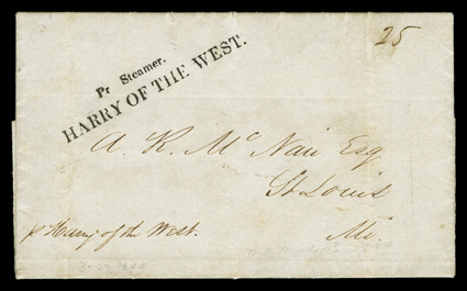 Louis, endorsed pr Harry of the West at lower left and manuscriptPr Steamer/HARRY OF THE WEST, fantastic strike of this two-line straightline handstamp on March 23, 1844 folded letter with integral address leaf datelined at New Orleans to St. Louis, endorsed "pr Harry of the West" at lower left and manuscript "25" rate, light file fold just touches the marking, still extremely fine and choice; fewer than four reported examples.Harry of the West was a side-wheeler of 490 tons built in 1843, but there is no information as to where she was built or her final disposition. (Image) Est. $1,000-1,500