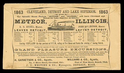 the Meteor and the Illinois giving schedules, etc., fresh andSteamer Illinois/Aug 12 1863/E Harbor, clear circular handstamp tying 3c Rose (#65) to buff cover to Eagleharbor, Michigan, reverse with all-over printed advertisement for both the Meteor and the Illinois giving schedules, etc., fresh and very fine. (imagea) (Image) Est. $1,000-1,500